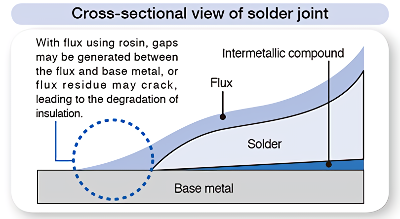 Rosin has been used as the main component of flux, and because it is inexpensive and readily available, it has long been in wide use. However, some products require thorough cleaning after soldering. Incomplete cleaning could result in creating gaps between the metal and solder caused by liquefaction or cracking the flux residue*, allowing moisture between the printed board and electrode, which results in the corrosion or degradation of insulation.
