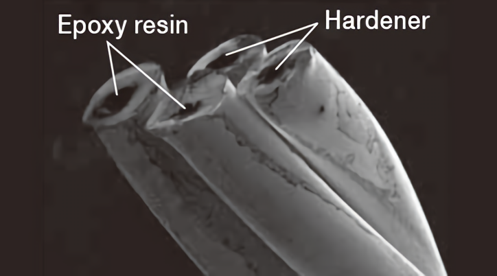 This solder with fl ux cream allows effi cient soldering at many points, but is not suitable for minute repair work to deal with defects. In response to a request from the manufacturing department, we worked to solve this issue and developed a solder containing thread-like epoxy fl ux, which has four solder threads, each of which has epoxy resin and hardener to solidify the solder injected at the center.