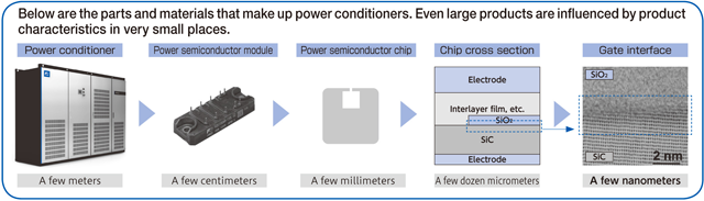 While there exist many products including power semiconductors for analysis, disk media, inverters, electromagnetic switches, and vending machines, the common point is that the properties of these products are affected at small places on molecular and atomic levels. For example, in the case of power conditioners equipped with SiC* power semiconductors, for energy-saving vending machines, the gate interface of the power semiconductor chip (the boundary of the SiC substrate and the oxide film) is a heat-insulating fiber hole (gap) in the vacuum insulation material that is needed to keep in heat. The size of each of the products is on a nano level (with a nanometer being one millionth of a millimeter), and as information on the product shapes and compositions can be obtained by irradiating them with electron beams and X-rays, we clarify the phenomenon that affects the products.