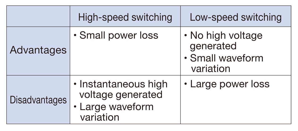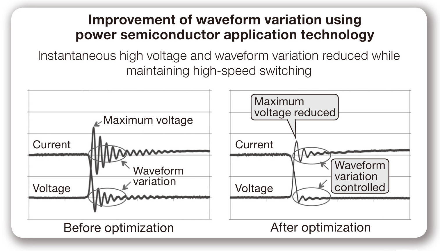 Increasing the switching speed may cause instantaneous high voltage or large waveform variation, and the noise generated may affect the peripheral circuits. The research task for us in the Main Circuit Development Department is the question of how to solve these problems to reduce any adverse effects on the power semiconductors themselves or the equipment on which they are mounted while at the same time achieving higher switching speeds.