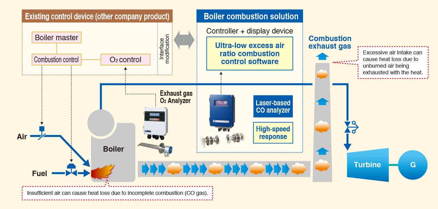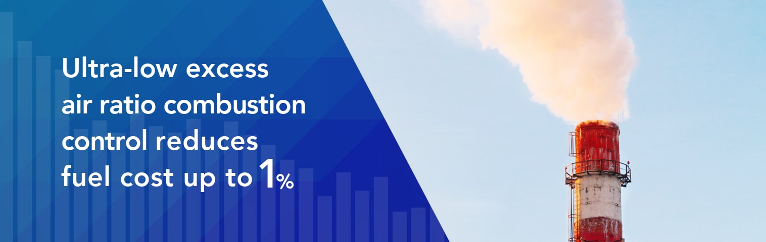 Conventional common control systems detect the O2 concentration in boiler exhaust gas and control the air-fuel ratio (ratio for theoretical air volume) to ensure the required concentration (represented by the orange area in the diagram on the following).