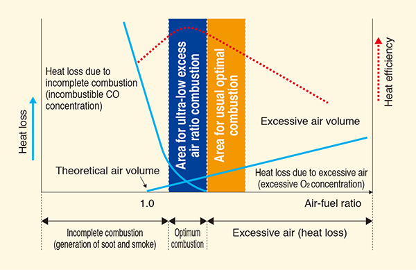 It is possible to reduce heat loss by further lowering the air-fuel ratio, but just as it was confirmed earlier, Fuji Electric has been able to develop a practical combustion control solution in the “area for ultra-low excess air ratio combustion” (represented by the blue area in the diagram on the following) for continuously generating CO in regularly minute amounts in the exhaust gas.