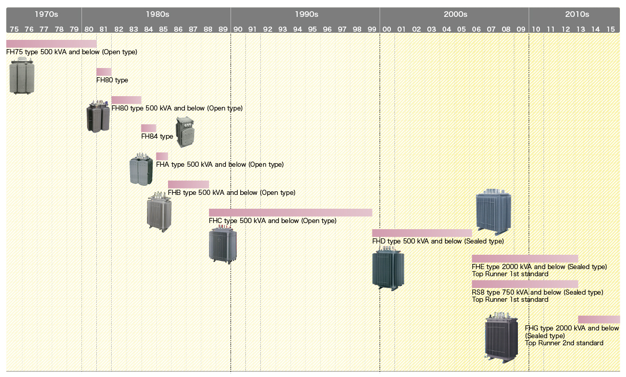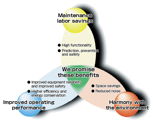 Upgrade of aged transformers will bring you not only improved reliability of the transformers but also higher performance due to the up-to-date manufacturing technologies used. Also by replacing H-class dry-type transformers and oil-immersed transformers with molded transformers, you can enjoy huge benefits such as significant operational cost reduction and overall performance improvements including low loss, small size and lightness, fire resistance, insulation performance, humidity resistance and maintainability.