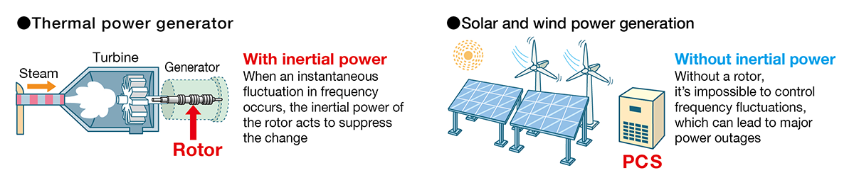 Large-scale generators, such as those at thermal and hydroelectric power plants, have been supporting grids and using their “inertial power” generated by rotational force to keep frequencies constant.However, there is no inertial power in currently available renewable energy generation.If a large amount of electricity generated by solar or wind power is fed directly into a grid, the frequency will become unstable, and in a worst case scenario, it could cause a large-scale power outage.