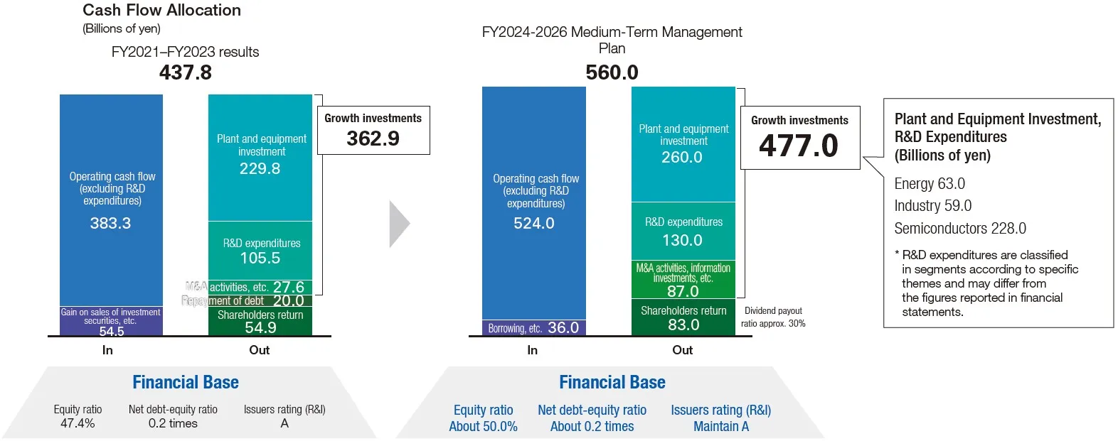 We will continue to focus investments in the growth areas of energy, industry, and semiconductors. Of the total plant and equipment investment of ¥254 billion planned over the next three years, 96% will be directed toward these growth areas. Similarly, 82% of the ¥130 billion allocated to R&D expenditures will be focused on these fields. In plant and equipment investment, we will prioritize expanding semiconductor production capacity while increasing environmental investments. In R&D, we will concentrate on developing new products and creating new businesses related to the green transformation market.