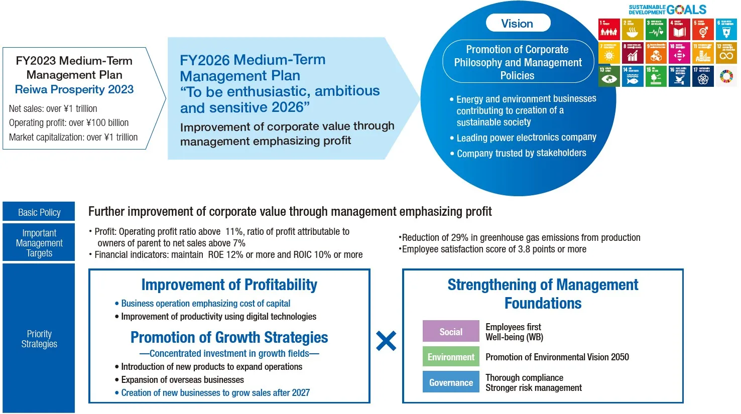 In pursuit of embodying our corporate philosophy and management policies, we aim to play a role as a leading company in power electronics, contributing to the realization of a sustainable society through our energy and environment businesses. Our goal is to continue to be a company that is trusted by all our stakeholders, including our employees, shareholders, and business partners. In the FY2026 Medium-Term Management Plan, we return to the core of our management principles under the corporate slogan "To be enthusiastic, ambitious and sensitive." As we adapt to the changing times—such as accelerating the transition to a decarbonized society and the advancement of digitalization—we are committed to improving profitability, promoting growth strategies, and strengthening our operating foundation to support sustainable growth in corporate value. Our basic policy is to improve corporate value through management emphasizing profit. This involves not only focusing on operating profit (ratio) but also placing emphasis on profit attributable to owners of parent (or its ratio to net sales) and managing with an awareness of capital costs. The cash generated through this approach will be directed toward growth investments.